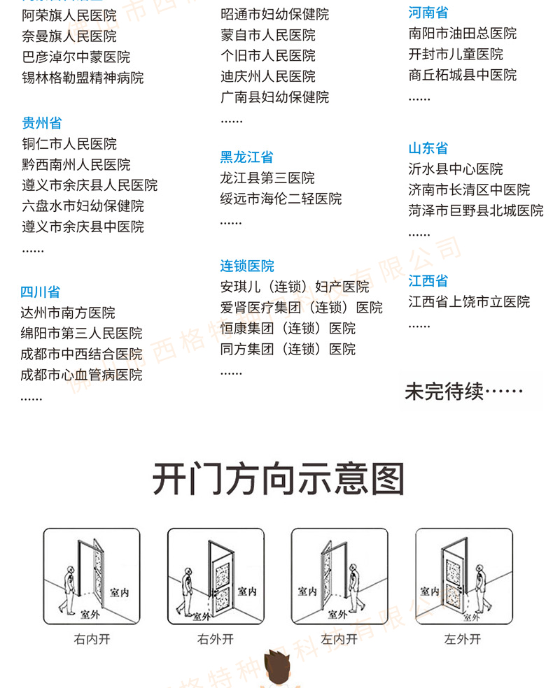 產品簡介:chnsige西格特種門,專業生產醫院門,醫院診室門,醫院辦公室門,醫院衛生間門,木質醫院門,鋼質醫院門,多鐘款式、顏色,尺寸可定制。